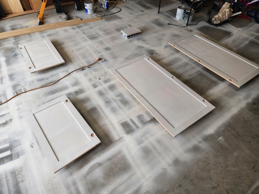The doors for the vanity were built at the same time as the doors for our primary closet, so I primed them at the same time. The two spaces were painted different colors, so had to spray the color separately, but I like to get as much painted as possible when pulling out the sprayer.